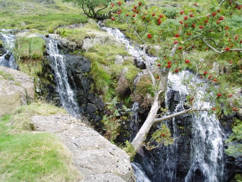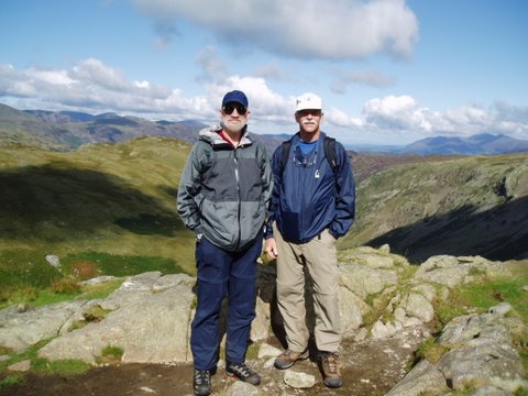 Day 3: Stonethwaite to Grasmere Our first really sunny day. Anticipating a shorter day, we planned a late start, with a good breakfast at 8:30. FULL breakfast, though James has started refusing the beans. For Americans, perhaps a description of a full English breakfast is in order. Cereal and juice, followed by a plate containing a fried egg, baked beans, mushrooms, hash browns, English Bacon, sausage, and broiled tomato. Toast, with butter and jam. Coffee or tea. On the trail by 9:30, crossing the footbridge at Stonethwaite to join the path, and gradually up the valley alongside Greenup Gill, with great views back towards Borrowdale. We were a little slow going up, particularly the steep last climb to Lining Crag. We met an older English couple going the opposite way, who immediately detected that we were not local, and told us that if you meet someone coming down at 11am, it would always be a local out for the exercise. They had been up from Borrowdale and were headed back down. Told us they had not done this climb for 30 years. Good on them.
