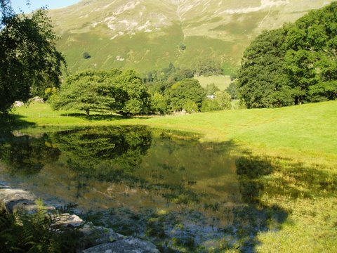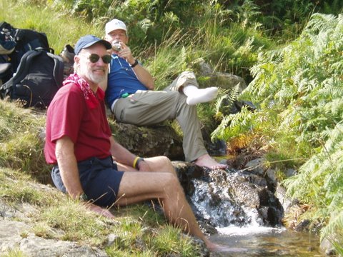 Starting from the head of Haweswater Reservoir, we made the long walk north along the slope above its western shore, enjoying the gentle breezes and warm sun. Stopped by a small stream where we met again with Anna, sometime walking companion, and her friendly dog Yorick. Boots off and a soak in the cool water before heading on past the dam.