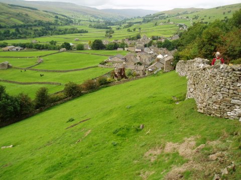 Passing through Gunnerside just before noon, we had to decide between waiting for the pub to open and pushing on and lunching on the oranges we had in our packs. We went on. Just on the outskirts of Reeth, we talked briefly with stone masons, Belkeniron and son, working to restore a stone house above the Swale. They wondered if we were the two walkers expected at their house that evening. We walked on with some regret that we had not spent more time appreciating his craft.